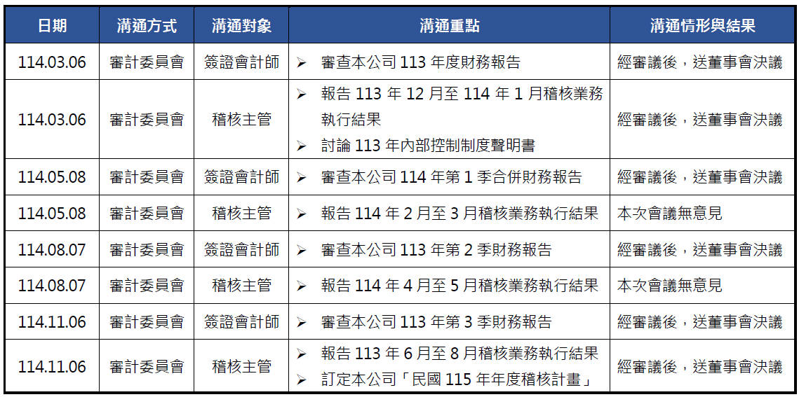 本公司審計委員會114年共召開5次會議,全體委員實際出席率平均為93%。本年度已完成之工作重點如下: