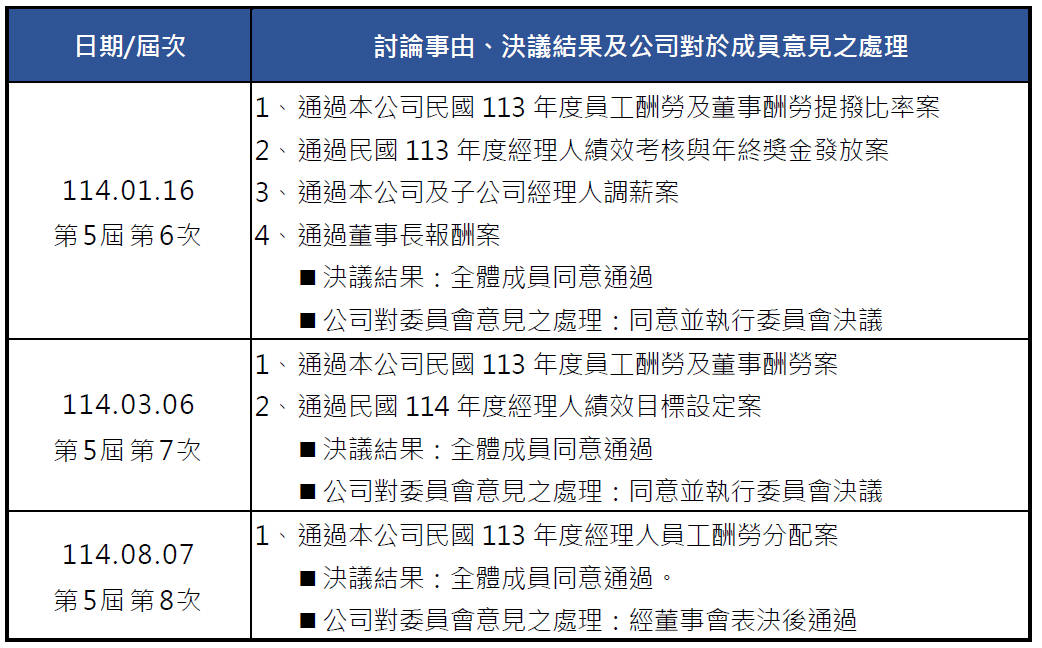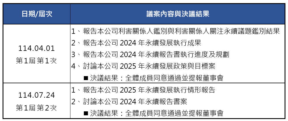 本公司永續發展委員會114年共召開2次會議,全體委員實際出席率平均為100%,運作情形如下: