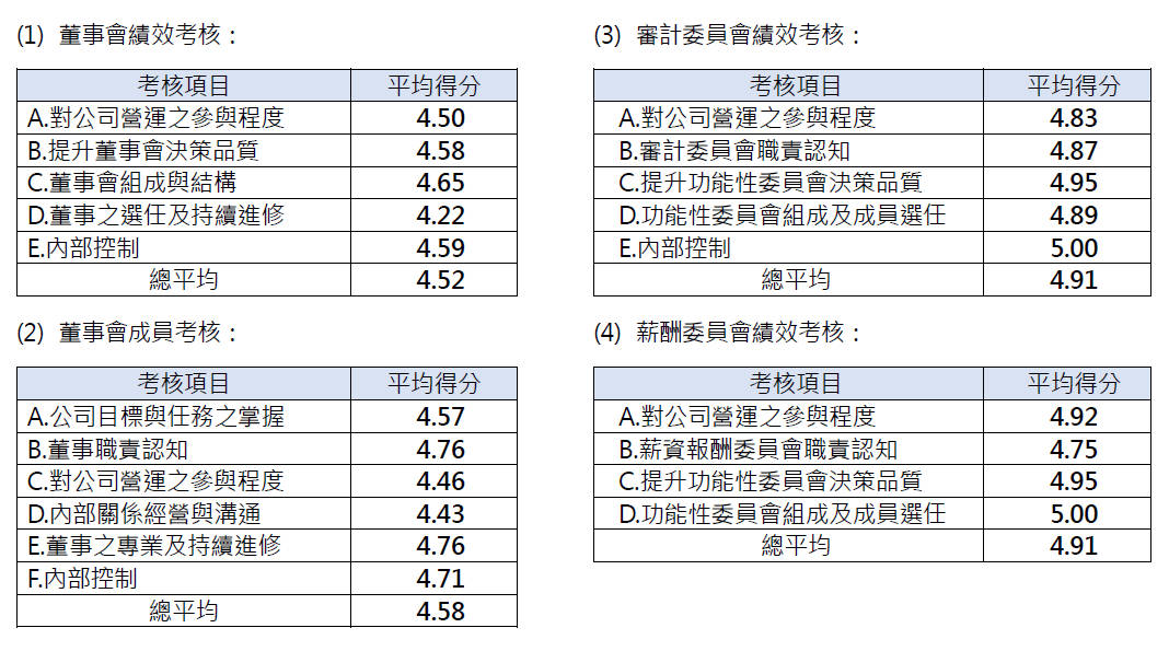 一、本公司於民國114年底執行當年度董事會、董事會成員及各功能性委員會之內部評估,各面向評估結果之平均得分大部分介於4.5~5分之間,顯示本公司整體運作情況尚屬完善,符合公司治理之要求。