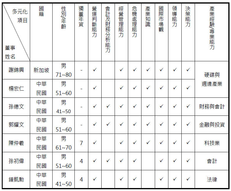 - 本公司現任七席董事之專業背景,含蓋商業、財務、會計、法律與公司所屬產業等領域,其中具員工身份之董事占比為0%;女性董事占比為0%;2位獨立董事任期年資為4年、1位獨立董事任期年資為7年;1位董事年齡在71~80歲、1位董事年齡在61~70歲、3位董事年齡在51~60歲、2位董事年齡在41~50歲、全體董事平均年齡約57歲。